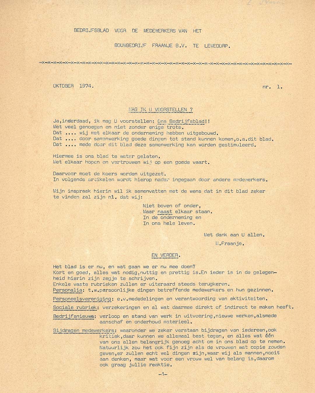 In de winter van 1974 schrijft Marien Fraanje het eerste stuk voor een nieuw personeelsblad. Daarmee wordt het fundament gelegd voor een blad dat informeert, verbindt en ruimte geeft aan een persoonlijke noot.